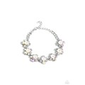 Dotted with white flower centers featuring an iridescent sheen and dainty silver studs, pronged round white and teardrop iridescent petals create a dazzling display of floral centerpieces that link around the wrist for a seasonal look. Features an adjustable clasp closure. Due to its prismatic palette, color may vary.