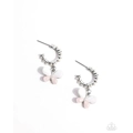 Pressed in a scalloped silver fitting, white pearls curl around the ear for a refined fashion giving way to a silver butterfly with white and baby pink sparkly resin wings for a whimsically sophisticated look. Earring attaches to a standard post fitting. Hoop measures approximately 5/8" in diameter.