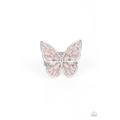 Shiny silver bars curl into the shape of a butterfly, creating a whimsical centerpiece that flutters atop the finger. Pink opalescent beads fill the inside of the wings, leaving spaces in between for the design to remain airy and light. Finally, tiny white rhinestones line the inside edges of the silver frame, adding a hint of irresistible sparkle to the mix. Features a wide stretchy band for a flexible fit.