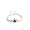 A brilliant emerald green rhinestone sparkles inside a circular frame of dainty white rhinestones. Curved silver bars adorned with a row of rhinestones connect on each side of the frame, wrapping around the wrist to complete the look. Features an adjustable clasp closure.