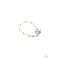 A shiny silver heart frame interlocks with a toggle closure at the center of a shiny silver and dewy white beaded bracelet. The silver toggle is stamped in the word, "love," for a romantic finish. Features a toggle closure.