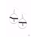 Infused with a dainty silver feather charm, a dainty row of rubbery black discs are threaded along a metallic rod inside an airy silver hoop for a free-spirited fashion. Earring attaches to a standard fishhook fitting.