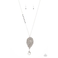 One side of a lengthened silver chain is dotted in dainty black crystal-like beads as it gives way to an oversized leaf pendant embossed in lifelike textures for a seasonal finish. A lobster clasp hangs from the bottom of the design to allow a name badge or other item to be attached. Features an adjustable clasp closure.