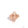 Swirls of shiny copper filigree twist into a billowy display atop the finger. The stenciled copper display allows the skin to peek beneath the airy pattern for a whimsical finish. Features a small dainty stretchy band for a flexible fit.