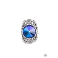 A dramatically oversized, iridescent blue gem is pressed into the center of an oval silver frame dotted and bordered in glassy white rhinestones, resulting in a sparkly filigree-filled centerpiece atop the finger. Features a wide stretchy band for a flexible fit. Due to its prismatic palette, color may vary.