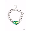 Featuring a UV shimmer, a raw cut green gem is pressed into a sleek silver frame that attaches to a bold silver chain around the wrist for a glitzy grunge fashion. Features an adjustable clasp closure.