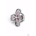 Dotted with a dainty white rhinestone center, silver petals overlaid with glittery pink rhinestones, sit atop studded silver filigree petals, creating a frilly floral centerpiece atop the finger. Features a stretchy band for a flexible fit.