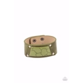 Featuring a faux marble finish, a green acrylic centerpiece attaches to an Olive Branch leather frame that is studded in place along a distressed Olive Branch leather band for a colorfully rustic fashion. Features an adjustable snap closure.