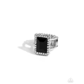 Bordered in a sparkly frame of white rhinestones, an oversized jet black emerald-cut gem adorns layered silver bands atop the finger for a jaw-dropping fashion. Features a wide stretchy band for a flexible fit.