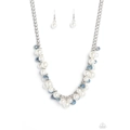 A faceted collection of glassy, blue crystal-like beads and classic white pearls in varying sizes flickers and flashes below the collar on a thick silver curb chain for a refined shimmer. Features an adjustable clasp closure.