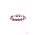 Dotted with vivacious pink beaded centers, studded silver frames are threaded along stretchy elastic bands and linked around the wrist for a whimsical look.