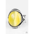 Etched in serrated textures, silver ribbons swoop around a glowing yellow moonstone for a whimsical look. Features a stretchy band for a flexible fit.