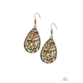 Varying in size, glittery aurum rhinestones are sprinkled along a studded brass teardrop for an edgy, yet glamorous look. Earring attaches to a standard fishhook fitting.