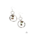 A warped silver hoop links with a hammered silver hoop, interlocking into a rustic lure. Threaded along a metal rod, tiger's eye and jade pebbles trickle from the top of the lowermost hoop for a tranquil finish. Earring attaches to a standard fishhook fitting.