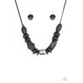 Featuring abstract geometric finishes, mismatched black wooden beads are threaded along shiny black cording. A dramatic silver bead adorns the center, creating a bold seasonal look below the collar. Features a button loop closure.