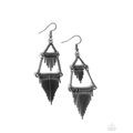 Suspended by gunmetal chains, curtains of gunmetal rods are threaded along gunmetal bars that edgily stack into a tapered fringe. Earring attaches to a standard fishhook fitting.