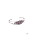 Oval and teardrop purple cat's eye stones adorn a frilly silver frame adorned in studded floral accents, creating a whimsical centerpiece atop a daintily layered silver cuff.