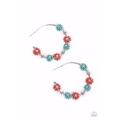 Adorned with shiny silver beaded centers, a dainty collection of white, turquoise, and red Branch seed beaded rings create earthy flower accents along a classic silver hoop for a grounding floral display. Earring attaches to a standard post fitting. Hoop measures approximately 1 1/2" in diameter.