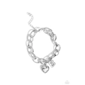 A simple collection of silver charms — including a white rhinestone heart pressed in a silver frame and a sleek letter "B" — dance from a chunky silver chain around the wrist, creating a sentimental fringe. Features an adjustable clasp closure.