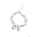 A simple collection of silver charms — including a white rhinestone heart pressed in a silver frame and a sleek letter "R" — dance from a chunky silver chain around the wrist, creating a sentimental fringe. Features an adjustable clasp closure. Sold as one individual bracelet