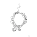 A simple collection of silver charms — including a white rhinestone heart pressed in a silver frame and a sleek letter "S" — dance from a chunky silver chain around the wrist, creating a sentimental fringe. Features an adjustable clasp closure.