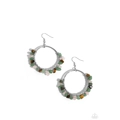 A colorful collection of chiseled jade, rose quartz, and tiger's eye stones are wrapped along the bottom of a shiny, silver hoop by shimmery silver wire for a handcrafted, earthy finish. Earring attaches to a standard fishhook fitting. As the stone elements in this piece are natural, some color variation is normal.