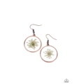 Dainty white firework flowers are encased inside a glassy casing bordered in an antiqued copper trim, creating a whimsical frame. Earring attaches to a standard fishhook fitting.