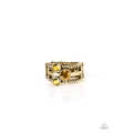 A trio of glittery aurum rhinestones are sprinkled along smooth and twisted brass bands, creating edgy layers across the finger. Features a stretchy band for a flexible fit.