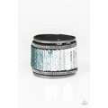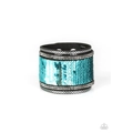 Infused with strands of smoky hematite rhinestones and dainty metallic accents, row after row of shimmery sequins are stitched across the front of a spliced black suede band. Bracelet features reversible sequins that change from blue to silver. Features an adjustable snap closure.