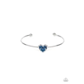 A studded silver heart is encrusted in emerald cut blue rhinestones, creating a flirtatious centerpiece atop a dainty silver cuff.