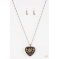 Vine-like filigree climbs the front of a locket inspired pendant for a vintage look. Featuring airy hearts on the back, the front of the dramatic pendant is sprinkled in glittery topaz rhinestones for a regal finish. Features an adjustable clasp closure.