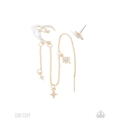 A white rhinestone-encrusted gold crescent moon gently shimmers atop the ear on a gold barbell cuff, creating a stunning statement. A collection of gold stars is attached to a dainty gold classic chain that extends below the lunar cuff, attaching to a thin gold threading cap fitting for the ability to weave along the ear across multiple piercings for a cosmically chic look. A three-dimensional gold star dusted in white rhinestones stands out as a solitaire post for the other earring for a magically, mismatched look.