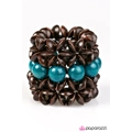 Earthy wooden accents are threaded along elastic stretchy bands, creating an ornate bracelet. Tinted in shiny brown and blue finishes, bright wooden beads line the center of the summery pattern for a colorful finish.
