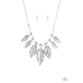 Featuring lifelike detail, hammered silver leaf frames are threaded along an invisible wire below the collar. Infused with dainty silver and refreshing white stone beads, the leafy frames gradually increase in size for an artisan inspired finish. Features an adjustable clasp closure.