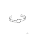 Featuring a hammered circle centerpiece, imperfect silver bars connect into a rustic cuff around the wrist.