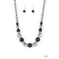 A collection of oversized shiny black, silver rings, and asymmetrical silver beads are threaded along an invisible wire below the collar. White rhinestone encrusted rings are sprinkled between the refined beading for a statement-making finish. Features an adjustable clasp closure.
