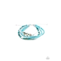 A mismatched collection of metallic beads, blue wooden beads, and iridescent crystal-like beads are threaded along gray threaded and glittery blue leather cording, creating stellar layers around the wrist. Features an adjustable sliding knot closure.