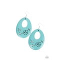 The bottom of a turquoise blue wooden teardrop frame features bird and floral cutouts, creating a whimsical centerpiece. Earring attaches to a standard fishhook fitting.
