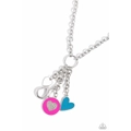 A Pink Peacock-painted disc charm with a white rhinestone-heart center and blue, white, and silver heart charms swing from the bottom of a lengthened silver link chain for a romantically clustered look. A lobster clasp hangs from the bottom of the design to allow a name badge or other item to be attached. Features an adjustable clasp closure.
