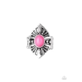 A vivacious pink stone bead is pressed into the center of an angular silver frame radiating with studded and antiqued textures. Features a stretchy band for a flexible fit.