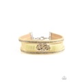 Metallic yellow leather strands layer across the wrist. Infused with rows of white rhinestones, yellow cording knots around the centermost strand, securing an airy heart and infinity charm in place for a whimsical finish. Features an adjustable clasp closure.