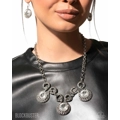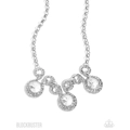 Three dramatically oversized white rhinestones are nestled into three hammered silver fittings connected through hammered silver rings to a silver cable chain, creating a hypnotizing haute look below the neckline. Features an adjustable clasp closure.
