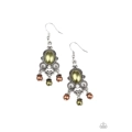 Dotted silver filigree spins around a pearly green bead and dainty white rhinestones, coalescing into a regal frame. A pearly fringe swings from the bottom of the frame for a refined finish. Earring attaches to a standard fishhook fitting.