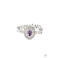 An oval purple rhinestone sits atop a circular frame stacked with dainty white rhinestones, creating a classic centerpiece atop the finger. Features a dainty stretchy band for a flexible fit.