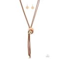 A trio of gold, brown, and fuzzy cheetah print discs overlap into an adjustable pendant along rows of shiny brown cording for a wildly retro look.