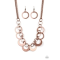 A collection of copper links and antiqued copper hoops connect below the collar, creating a refined fringe. Features an adjustable clasp closure.