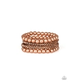 A collection of pearly copper beads and glistening copper chains are threaded along stretchy bands, creating a bold collision of industrial glamour.
