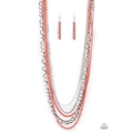 A collision of mismatched silver and vibrant coral chains layer down the chest for a colorful industrial flair. Features an adjustable clasp closure.