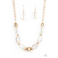 Featuring an icy iridescence, glassy asymmetrical beads joins a mismatched collection of gold beads, white rhinestone encrusted rings, and scalloped gold accents below the collar. Attached to a gold chain, the glacial display catches and reflects light for a statement-making finish. Features an adjustable clasp closure.