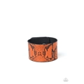 Featuring neon orange python print, a thick leather band wraps around the wrist for a colorfully wild look. Features an adjustable snap closure.